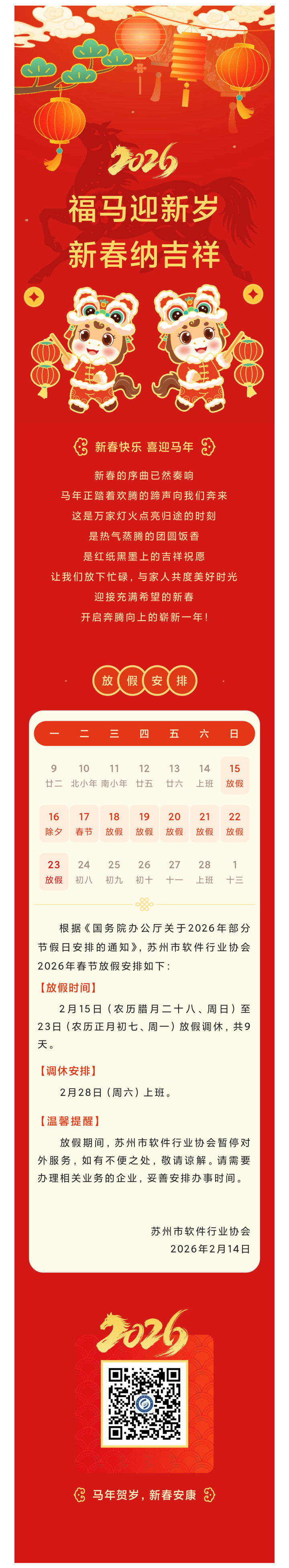 【放假通知】苏州软协秘书处2026年春节放假通知